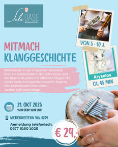 Kinder zwischen 5 und 10 Jahren erleben eine zauberhafte Mitmach-Klanggeschichte, in der sie selbst aktiv werden: Jedes Kind erhält ein Instrument (z.B. Rassel, Triangel, etc.) und darf immer dann spielen, wenn ein bestimmtes Zauberwort in der Geschichte vorkommt. So entsteht ein zauberhaftes Klangspiel, das die Geschichte lebendig macht und die heilsame Wirkung der Salzoase spielerisch unterstützt.